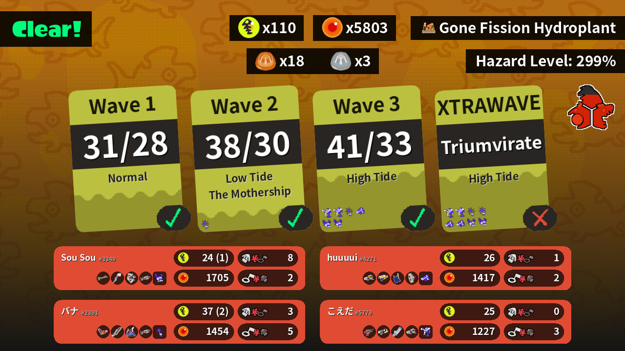 | Weapons | Bamboozler 14 Mk I Inkbrush REEF-LUX 450 Grizzco Charger | Hydra Splatling Splatana Wiper Slosher Grizzco Charger | Grizzco Blaster Splattershot Tri-Slosher Grizzco Stringer | Dualie Squelchers Splattershot Nova Mint Decavitator Grizzco Blaster |