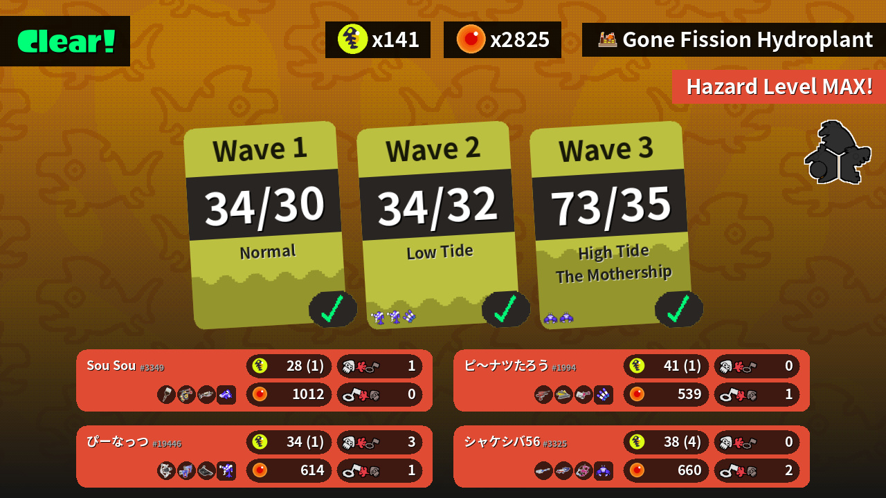 | Weapons | Octobrush Douser Dualies FF Grizzco Charger | Dualie Squelchers Dread Wringer Heavy Splatling | E-liter 4K Splattershot Pro Dapple Dualies | REEF-LUX 450 Glooga Dualies Bloblobber |