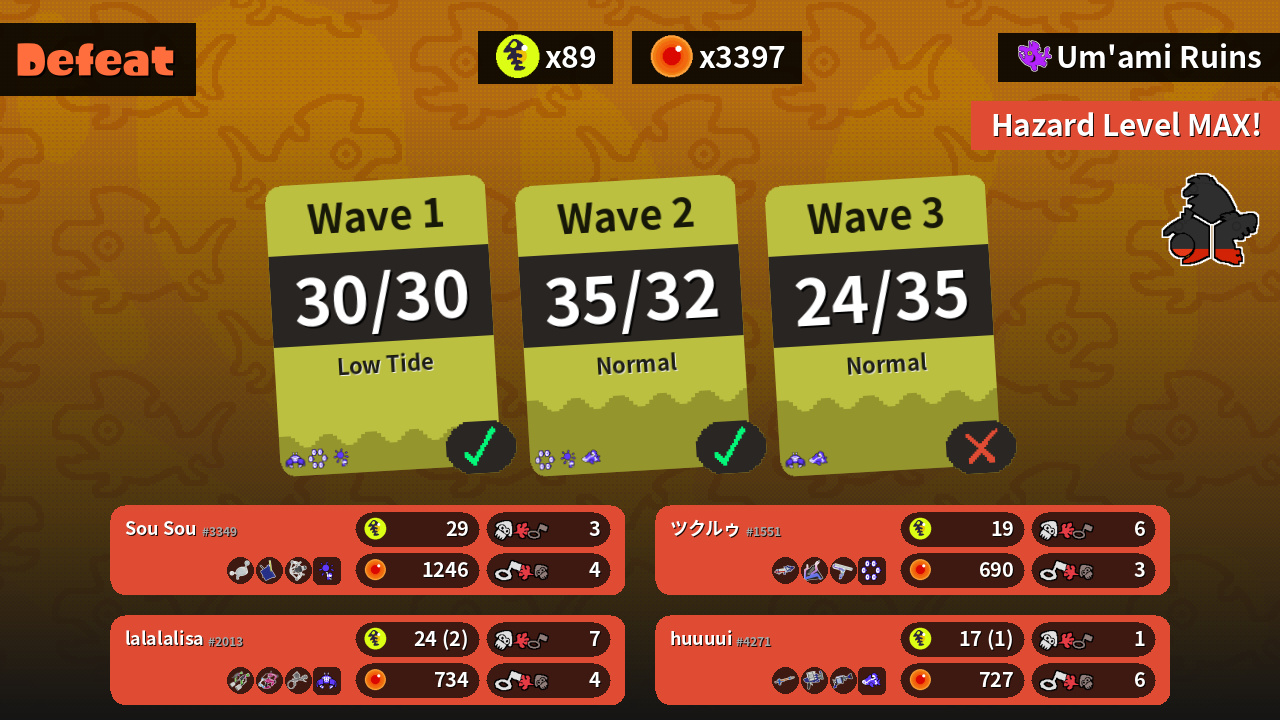 | Weapons | Luna Blaster Tri-Slosher REEF-LUX 450 | Splat Dualies Dapple Dualies Aerospray MG | Splattershot Pro Slosher Big Swig Roller | Snipewriter 5H Clash Blaster H-3 Nozzlenose |