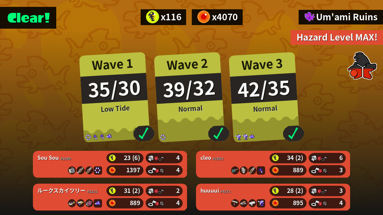 | Weapons | Sloshing Machine Splatana Wiper Grizzco Splatana | Jet Squelcher Grizzco Stringer Grizzco Splatana | Mini Splatling Splattershot Dapple Dualies | Carbon Roller Grizzco Blaster Splattershot Jr. |