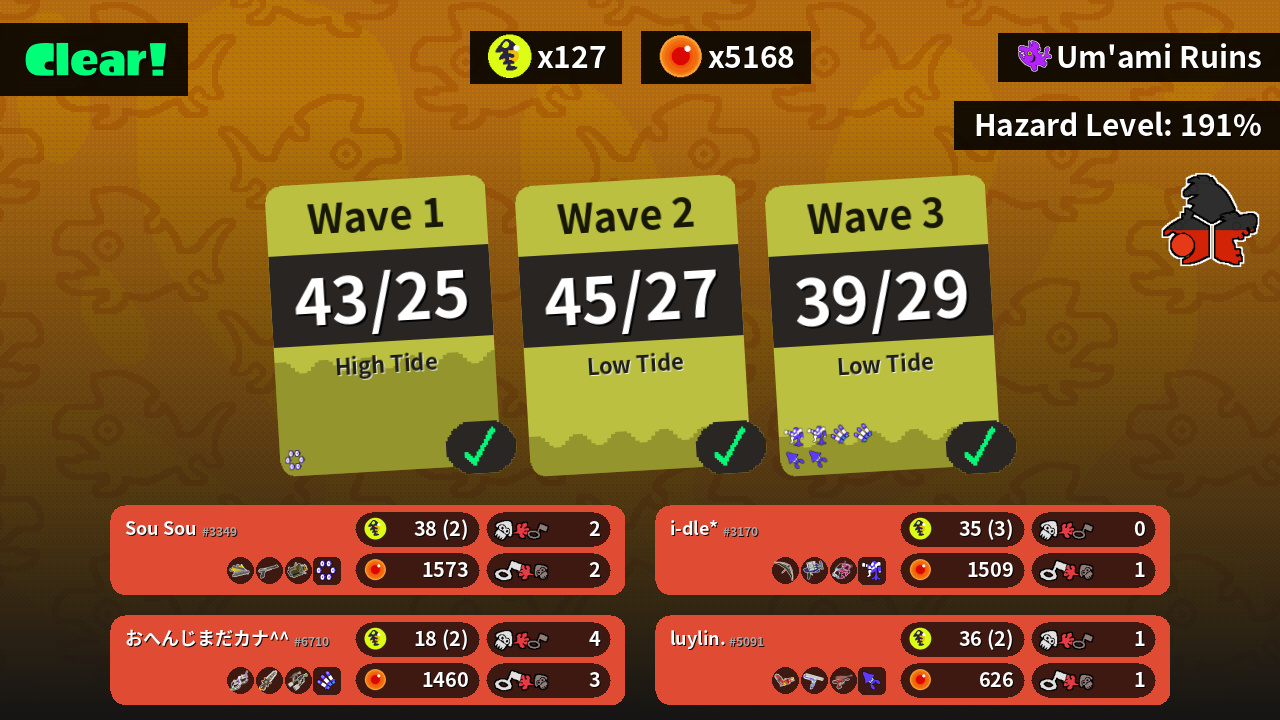 | Weapons | Dread Wringer N-ZAP '85 Explosher | Hydra Splatling Big Swig Roller Dualie Squelchers | Tenta Brella Clash Blaster Dapple Dualies | Dark Tetra Dualies Grizzco Splatana Splat Dualies |