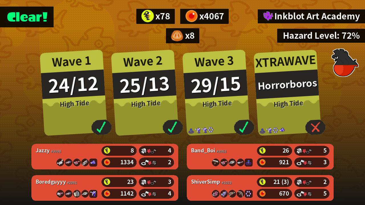 | Weapons | Luna Blaster Splattershot Pro Rapid Blaster Pro Dark Tetra Dualies | Carbon Roller Rapid Blaster Pro Grizzco Brella E-liter 4K | Heavy Splatling Splattershot Pro Sloshing Machine Grizzco Brella | Dapple Dualies Glooga Dualies Squeezer Tenta Brella |