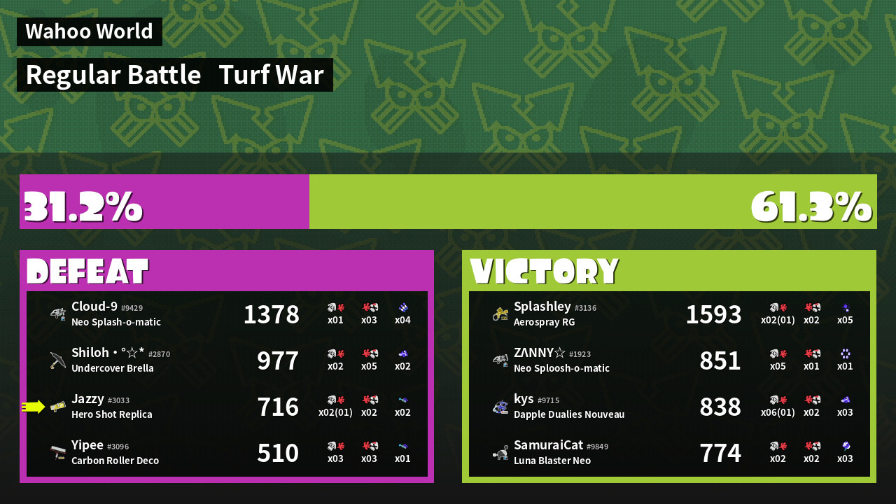 | Medals | #1 Splat Assister #1 Ink Consumer #1 Trizooka User | ||