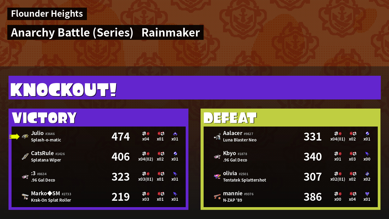 | Medals | #1 Overall Splatter #1 Turf Inker #1 Enemy Splatter | ||