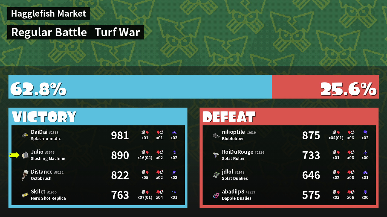 | Medals | #1 Overall Splatter #1 Popular Target #1 Enemy-Base Inker | ||