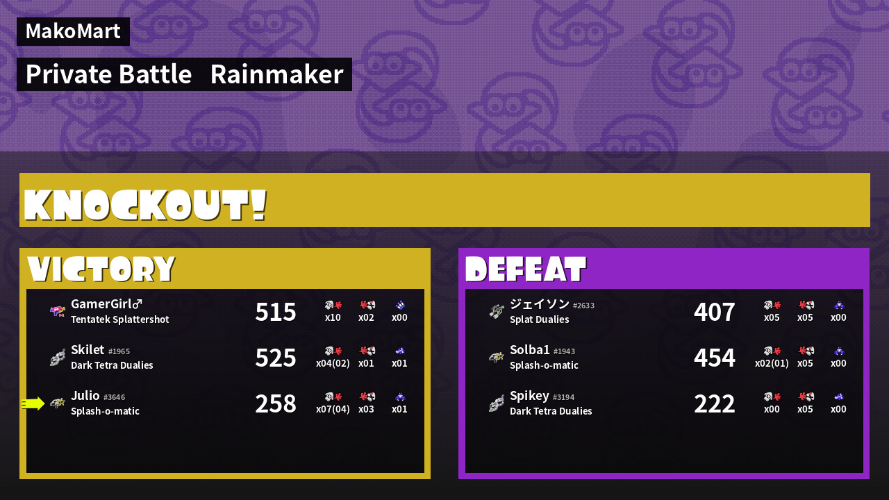 | Medals | #1 Splat Assister #1 Ink Consumer #1 Crab Tank User | ||