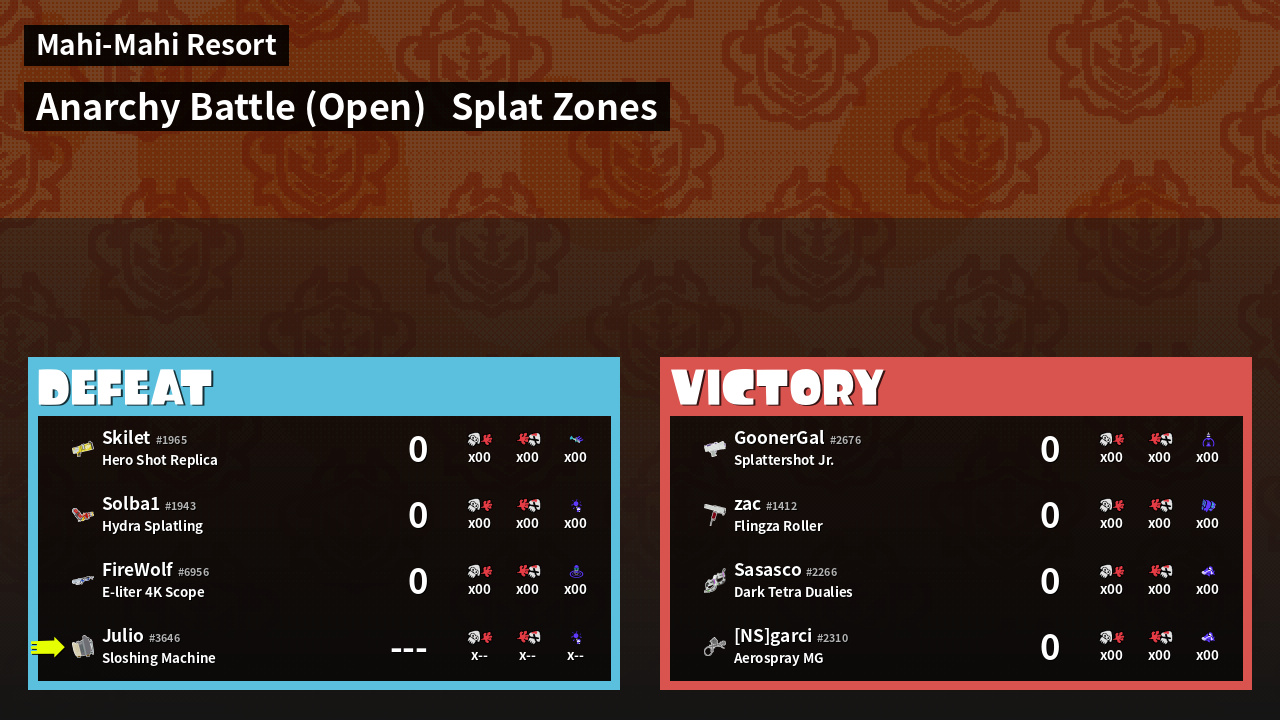 | Mode | Splat Zones - Anarchy Battle (Open) | ||