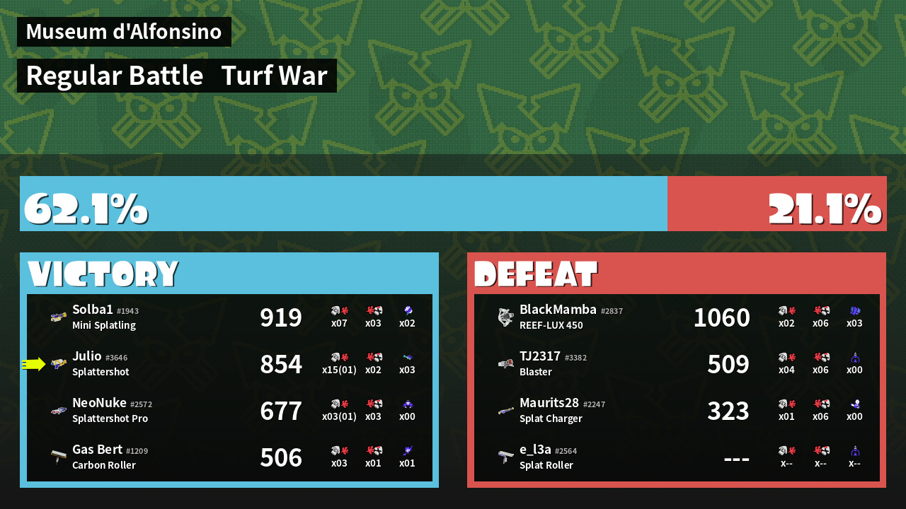 | Medals | #1 Overall Splatter #1 Popular Target #1 Enemy-Base Inker | ||