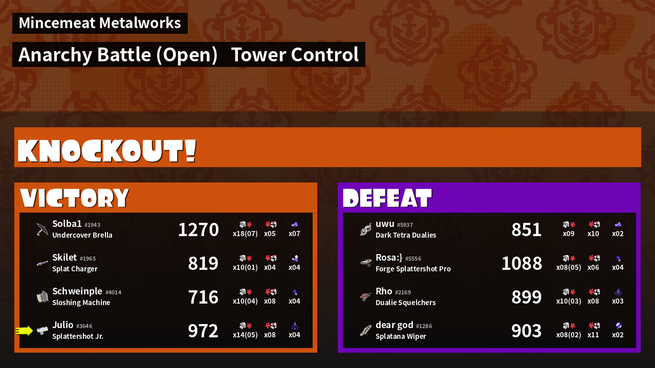 | Medals | #1 Checkpoint Breaker #1 Big Bubbler User #2 Overall Splatter | ||