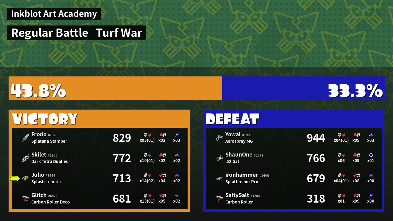 | Medals | #1 Overall Splatter #1 Enemy Splatter #1 Splat Assister | ||