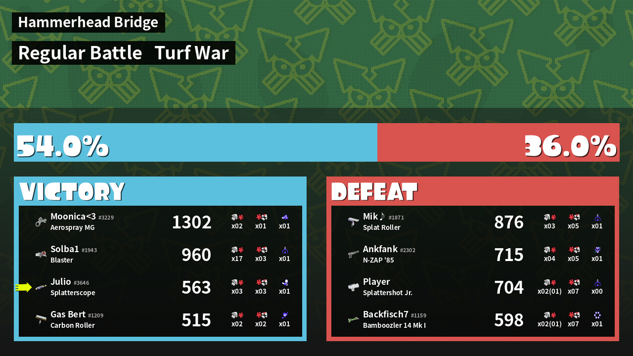 | Medals | #2 Overall Splatter #2 Popular Target #2 Enemy-Base Inker | ||