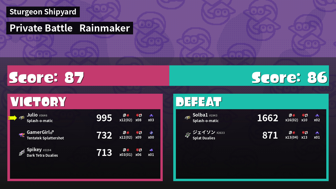 | Medals | #1 Overall Splatter #1 Turf Inker #1 Enemy Splatter | ||