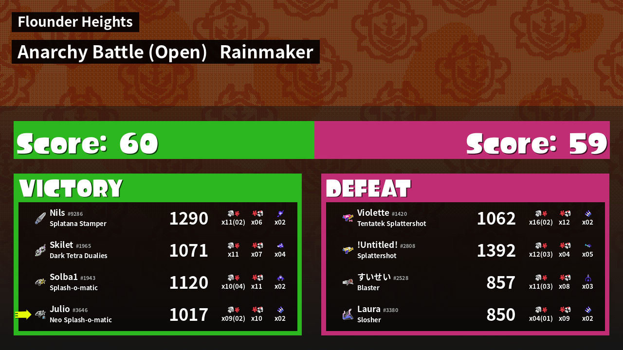 | Medals | #1 Rainmaker Stopper #1 Ground Traveler #2 Splat Assister | ||||