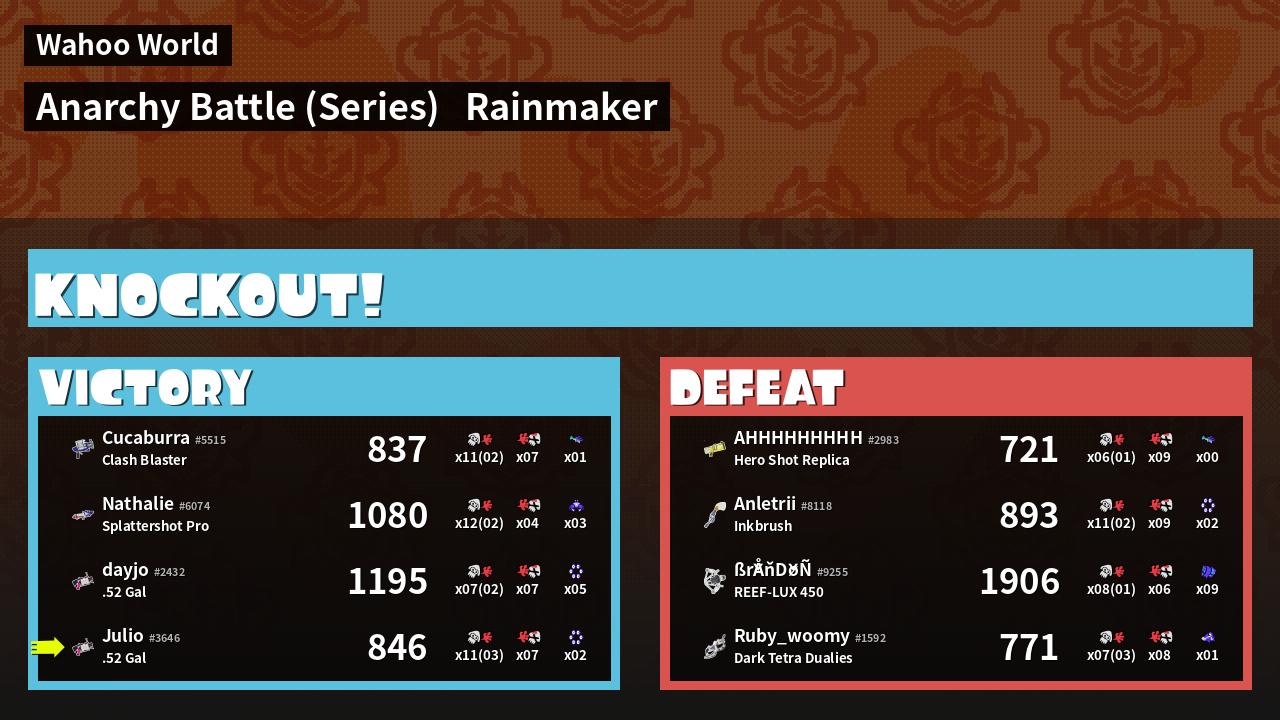 | Medals | #1 Splat Assister #1 Damage Taker First Splat! | ||