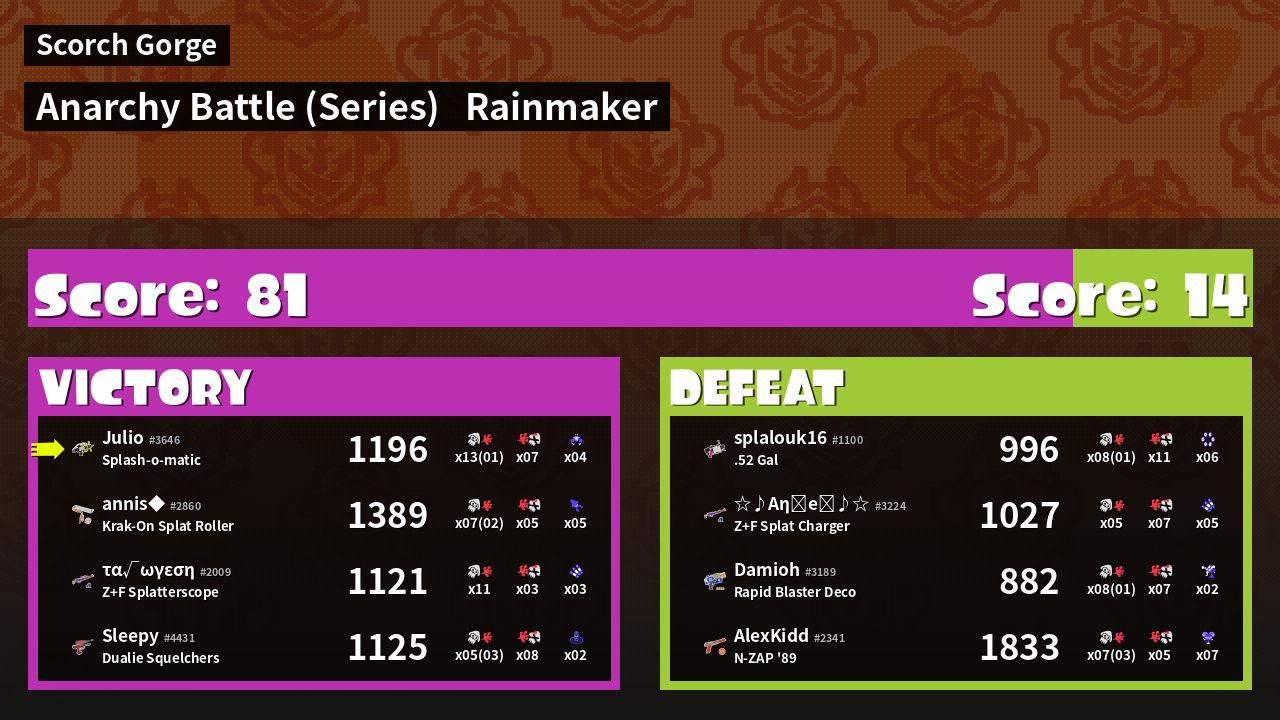 | Medals | #1 Overall Splatter #1 Popular Target #1 Enemy Splatter | ||