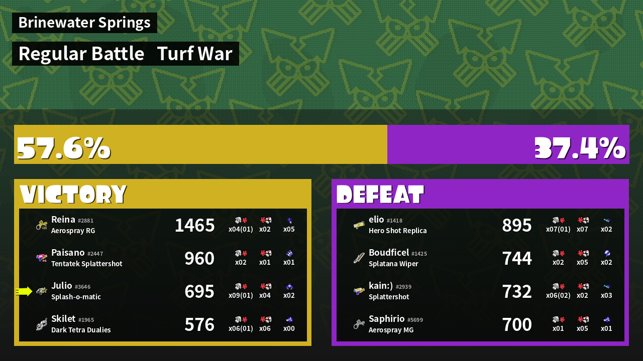 | Medals | #1 Overall Splatter #1 Enemy Splatter #1 Splat Assister | ||