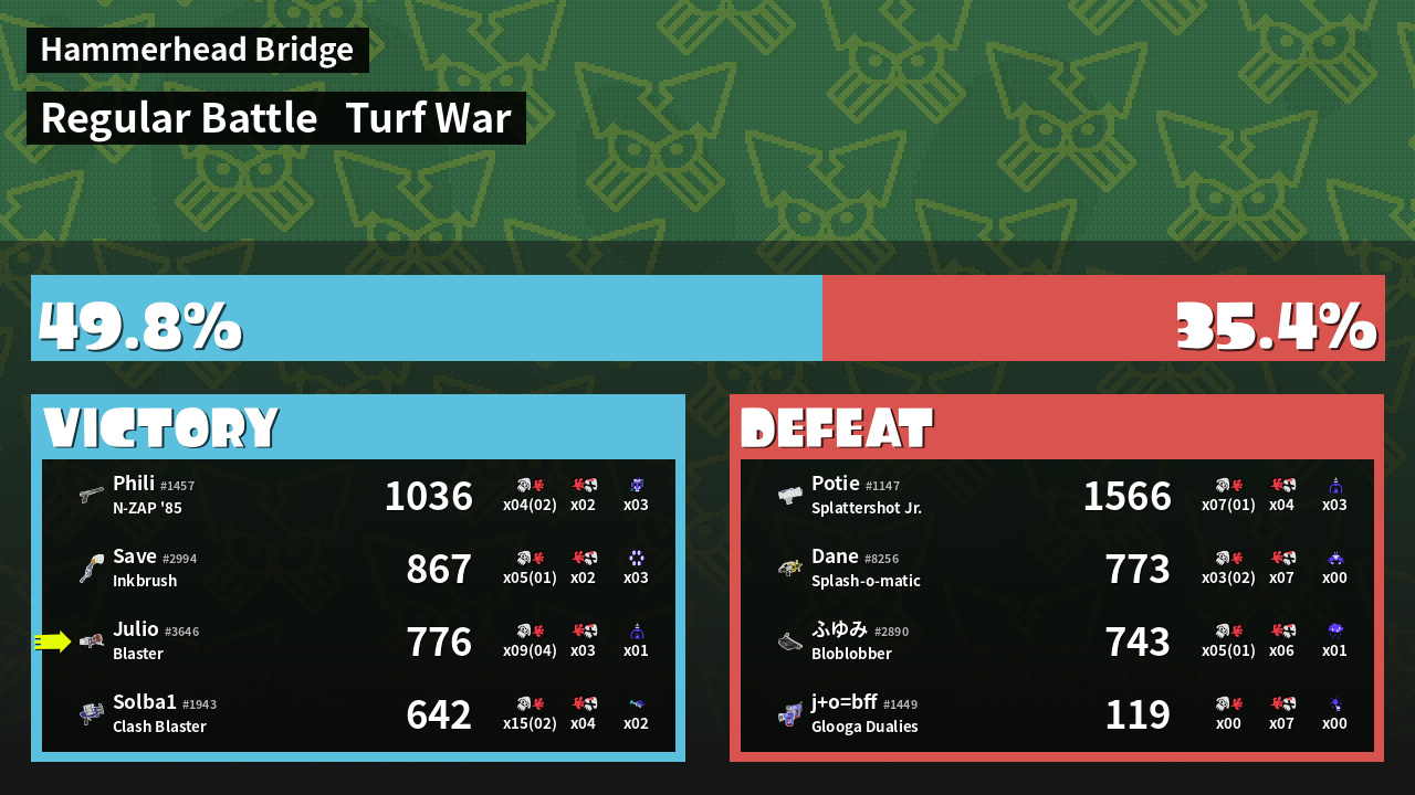 | Medals | #1 Popular Target #1 Enemy-Base Inker #1 Splat Assister | ||