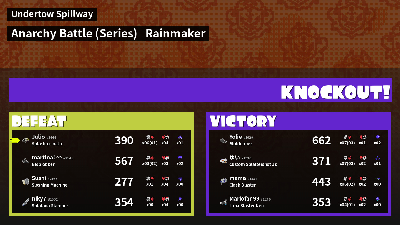 | Medals | #1 Overall Splatter #1 Super Jump Spot #1 Enemy Splatter | ||