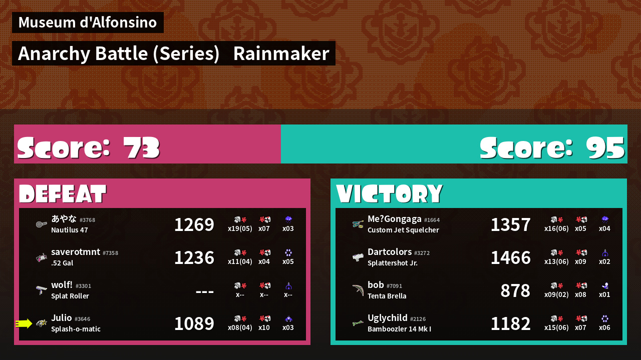 | Medals | #1 Ground Traveler #2 Super Jump Spot #2 Splat Assister | ||