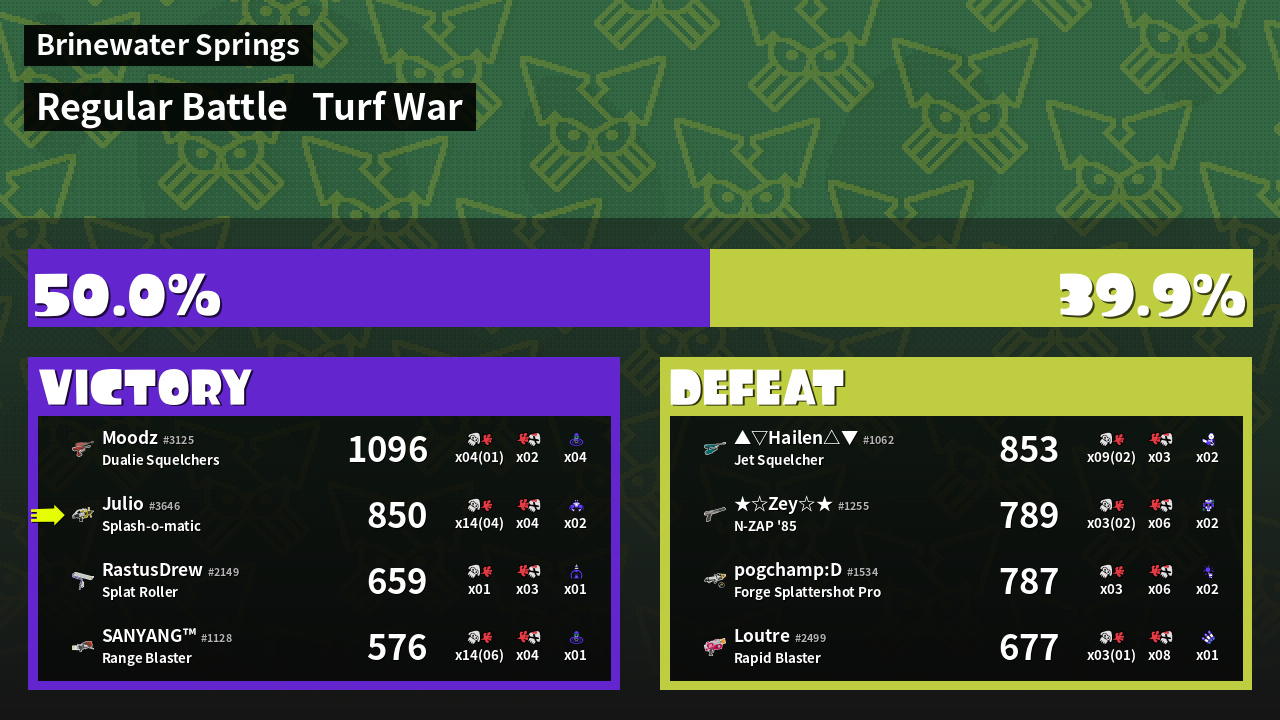| Medals | #1 Overall Splatter #1 Popular Target #1 Enemy-Base Inker | ||