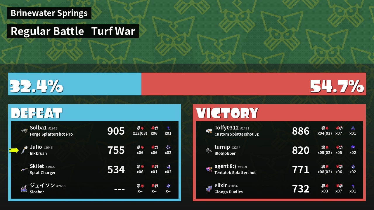 | Medals | #1 Home-Base Inker #1 Ground Traveler #2 Overall Splatter | ||