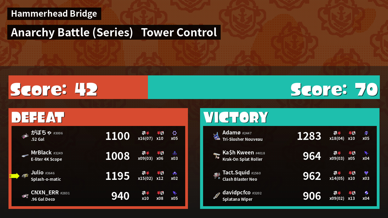 | Medals | #1 Turf Inker #1 Enemy Splatter #1 Tower Stopper | ||