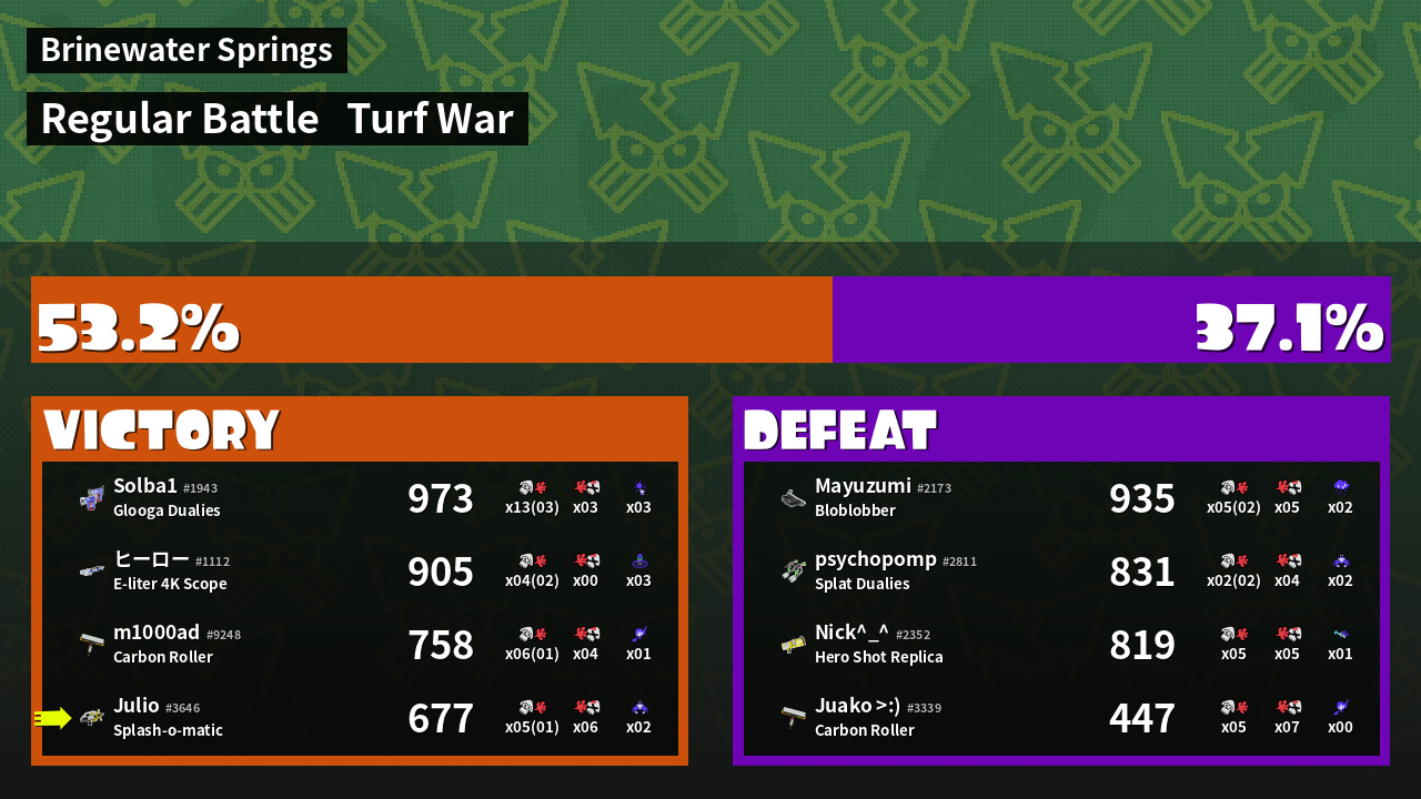 | Medals | #1 Crab Tank User #2 Popular Target #2 Enemy-Base Inker | ||