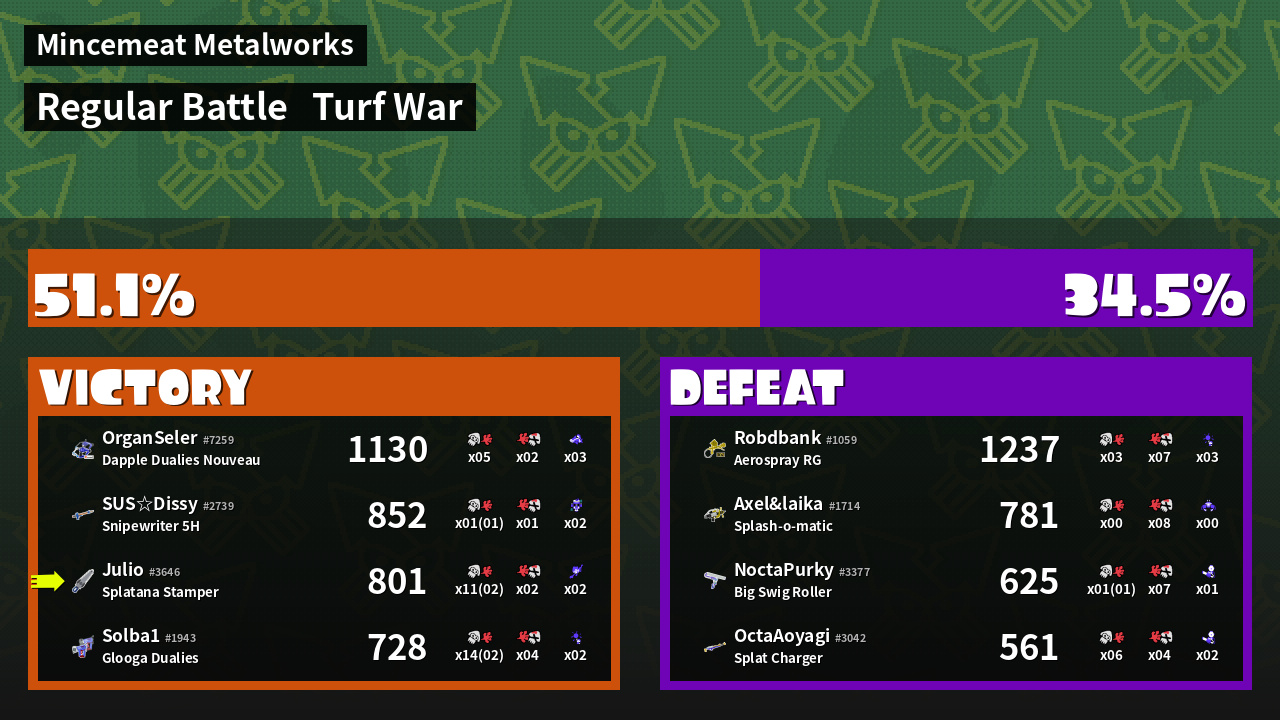 | Medals | #1 Enemy-Base Inker #1 Splat Assister #1 Damage Taker | ||