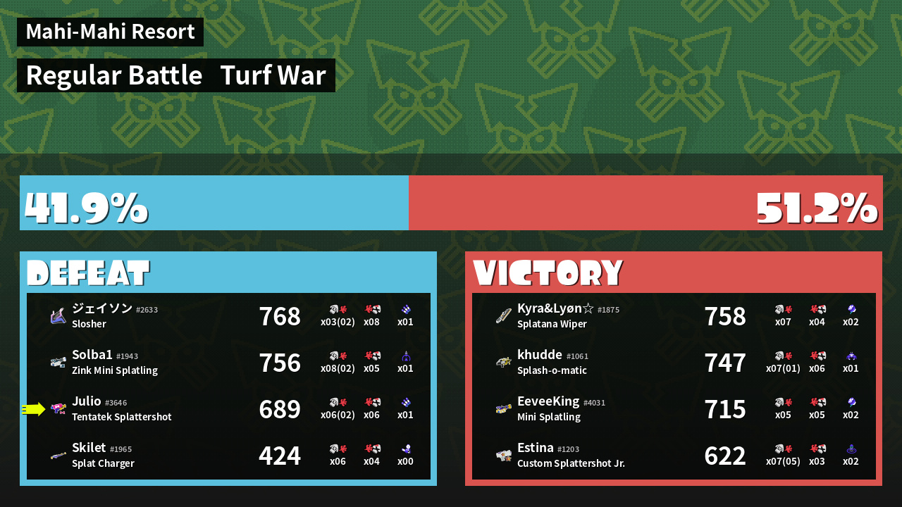 | Medals | #1 Splat Assister #1 Base Defender #1 Damage Taker | ||