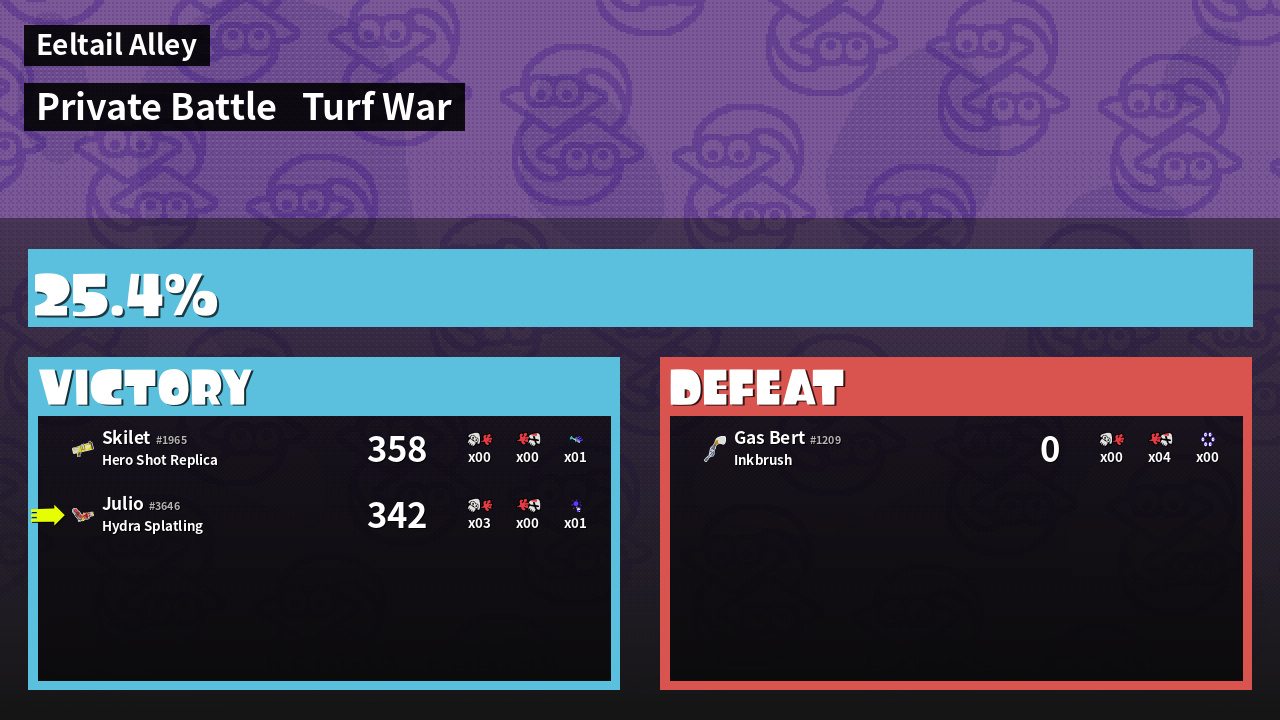 | Medals | #1 Overall Splatter #1 Enemy-Base Inker #1 Enemy Splatter | ||