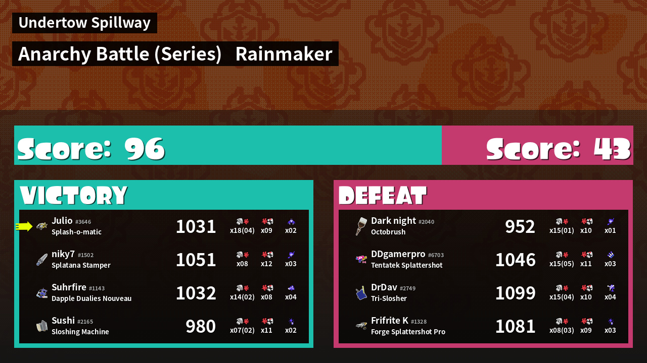 | Medals | #1 Overall Splatter #1 Enemy Splatter #1 Splat Assister | ||