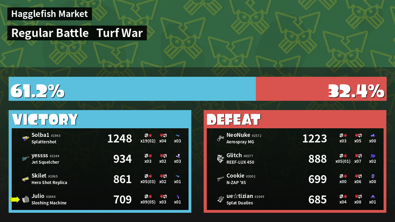 | Medals | #1 Splat Assister #2 Overall Splatter #2 Enemy-Base Inker | ||