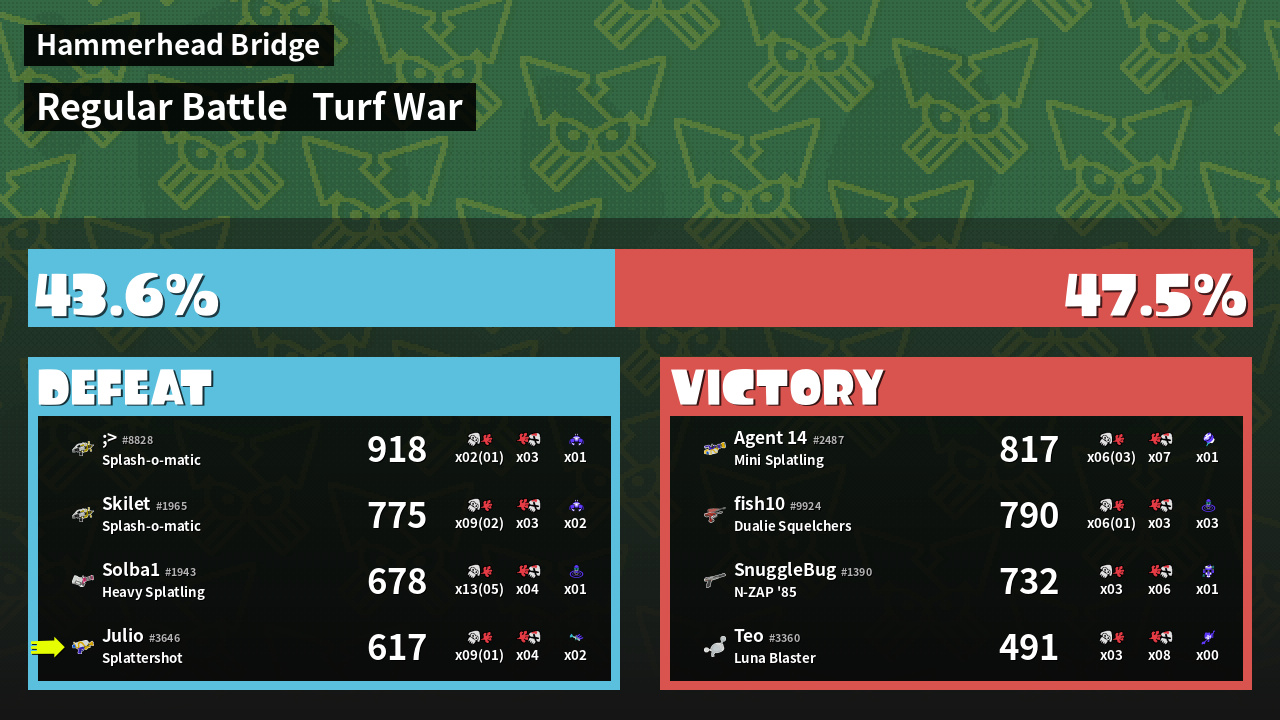 | Medals | #1 Enemy-Base Inker #1 Enemy Splatter #1 Damage Taker | ||