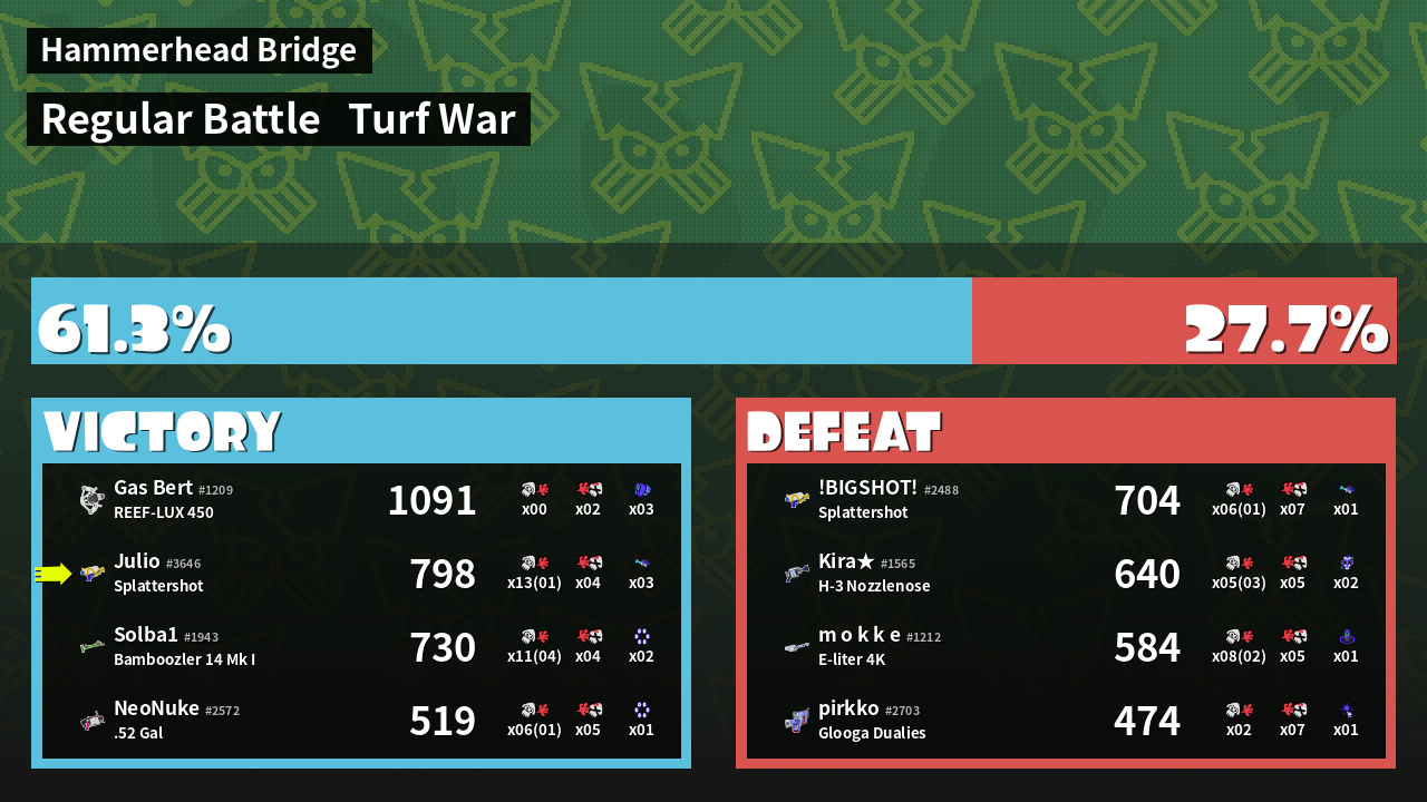 | Medals | #1 Overall Splatter #1 Enemy-Base Inker #1 Enemy Splatter | ||