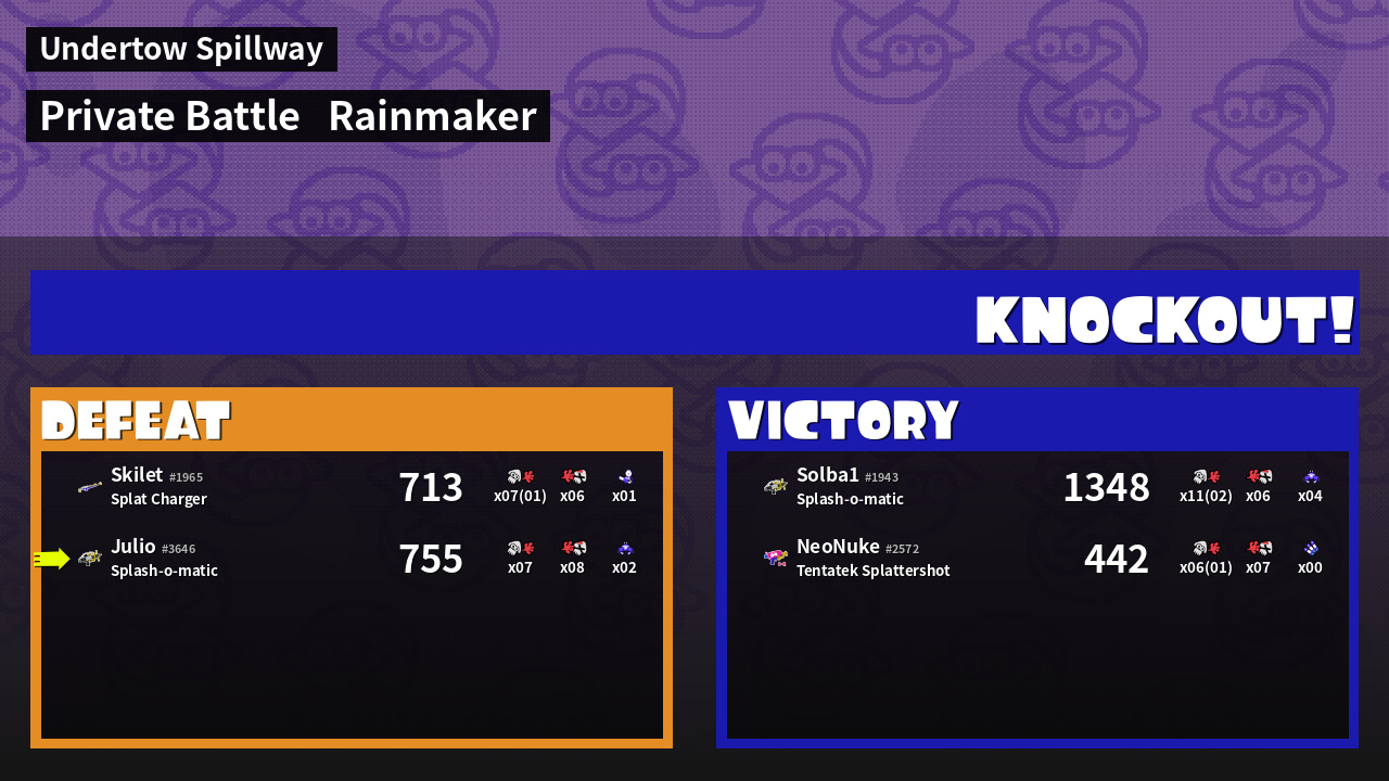 | Medals | #1 Overall Splatter #1 Turf Inker #1 Enemy Splatter | ||