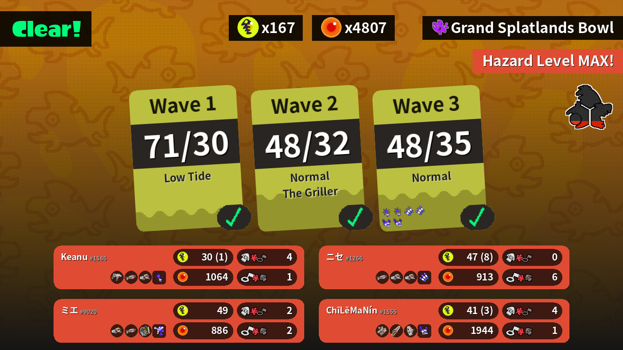 | Weapons | Grizzco Roller Grizzco Charger Grizzco Blaster | Grizzco Blaster Grizzco Charger Grizzco Slosher | Grizzco Charger Grizzco Blaster Grizzco Blaster | Grizzco Dualies Grizzco Splatana Grizzco Stringer |