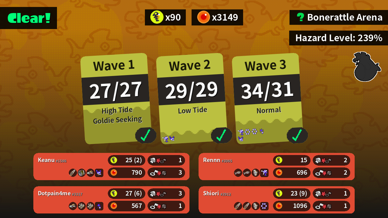 | Weapons | Grizzco Splatana Grizzco Slosher Grizzco Blaster | Grizzco Blaster Grizzco Dualies Grizzco Dualies | Grizzco Splatana Grizzco Splatana Grizzco Stringer | Grizzco Charger Grizzco Charger Grizzco Stringer |