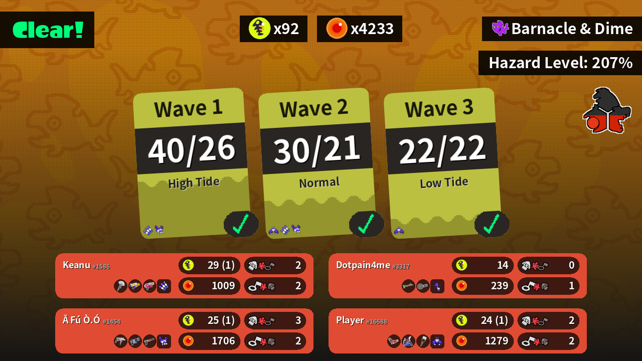 | Weapons | Painbrush Splattershot Rapid Blaster | Grizzco Roller L-3 Nozzlenose N-ZAP '85 | Hydra Splatling Slosher Octobrush | Bamboozler 14 Mk I Nautilus 47 ? |