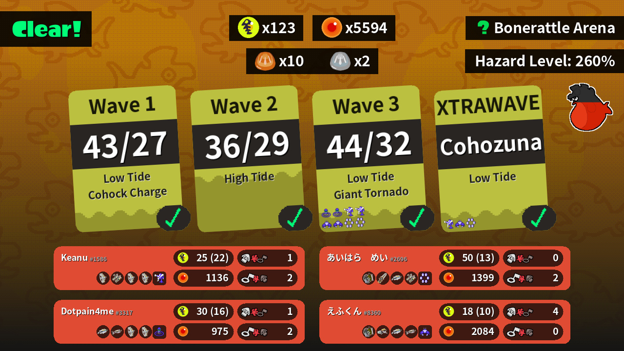 | Weapons | Grizzco Stringer Grizzco Dualies Grizzco Stringer Grizzco Stringer | Grizzco Slosher Grizzco Splatana Grizzco Brella Grizzco Dualies | Grizzco Brella Grizzco Charger Grizzco Stringer Grizzco Stringer | Grizzco Slosher Grizzco Blaster Grizzco Brella Grizzco Charger |