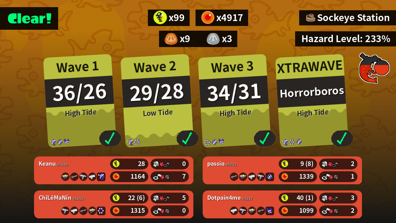 | Weapons | Splattershot Snipewriter 5H Big Swig Roller Splattershot Jr. | Splattershot Jr. Big Swig Roller Splattershot Snipewriter 5H | Big Swig Roller Splattershot Jr. Snipewriter 5H Splattershot | Snipewriter 5H Splattershot Splattershot Jr. Big Swig Roller |
