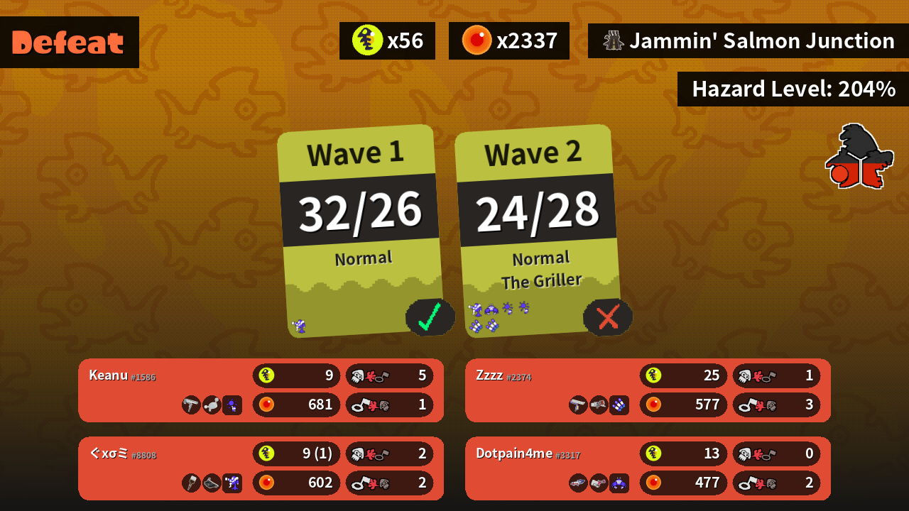 | Weapons | Dynamo Roller Luna Blaster | Splat Roller Blaster | Splattershot Pro Heavy Splatling | Octobrush Bloblobber |
