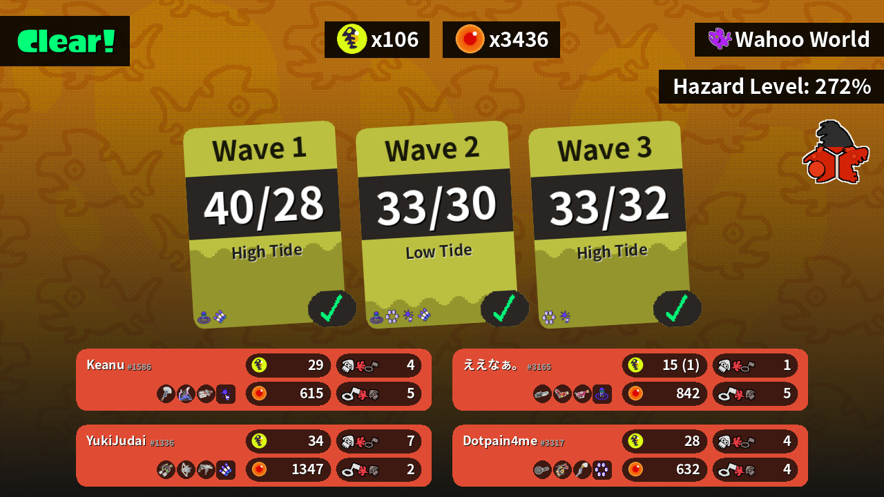 | Weapons | Painbrush Slosher Heavy Edit Splatling | Splat Dualies Tri-Stringer Grizzco Roller | Nautilus 47 Douser Dualies FF Inkbrush | Ballpoint Splatling Hydra Splatling Rapid Blaster Pro |
