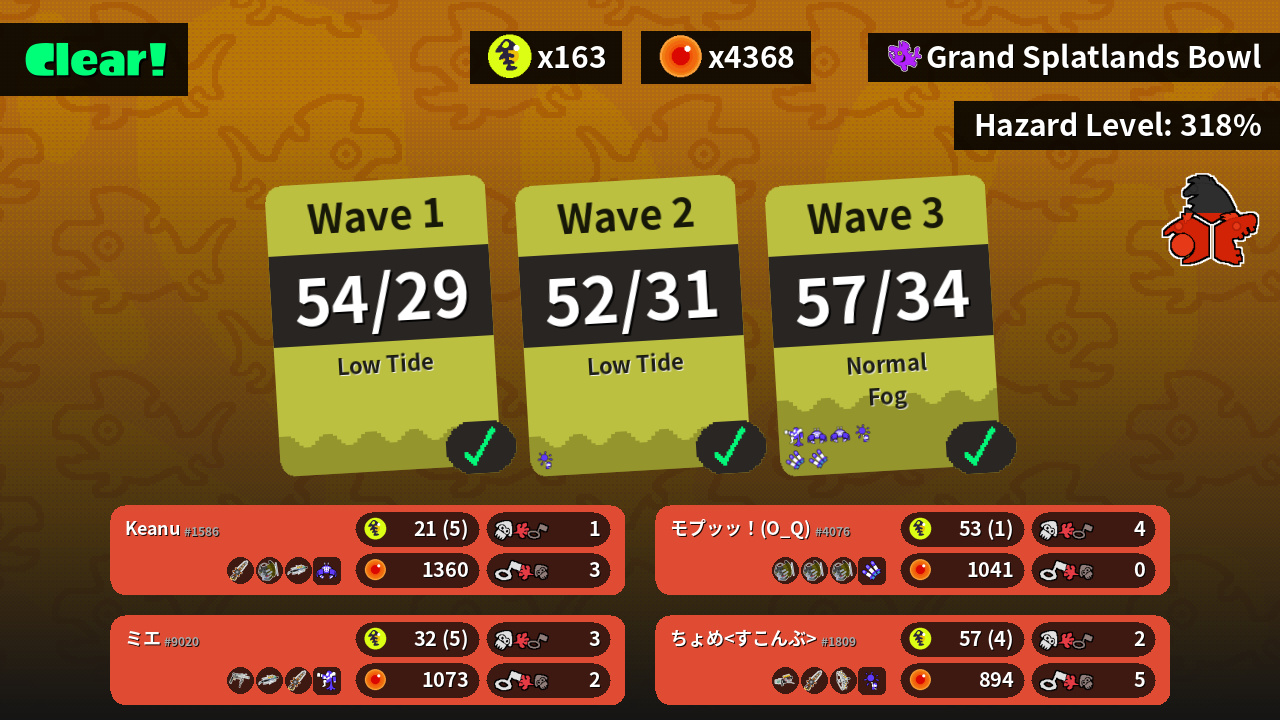| Weapons | Grizzco Splatana Grizzco Slosher Grizzco Brella | Grizzco Blaster Grizzco Splatana Grizzco Stringer | Grizzco Slosher Grizzco Slosher Grizzco Slosher | Grizzco Roller Grizzco Brella Grizzco Splatana |