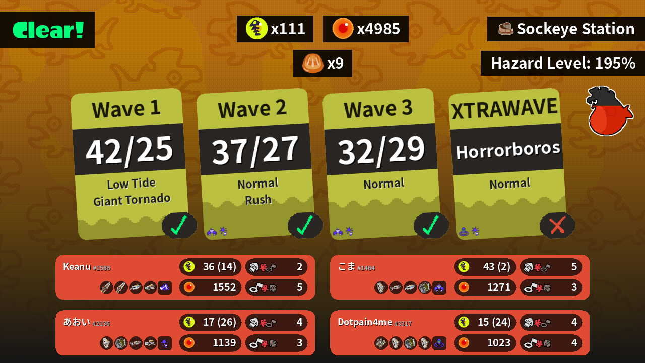 | Weapons | Grizzco Splatana Grizzco Splatana Grizzco Brella Grizzco Blaster | Grizzco Stringer Grizzco Charger Grizzco Brella Grizzco Slosher | Grizzco Stringer Grizzco Slosher Grizzco Charger Grizzco Blaster | Grizzco Dualies Grizzco Stringer Grizzco Slosher Grizzco Stringer |