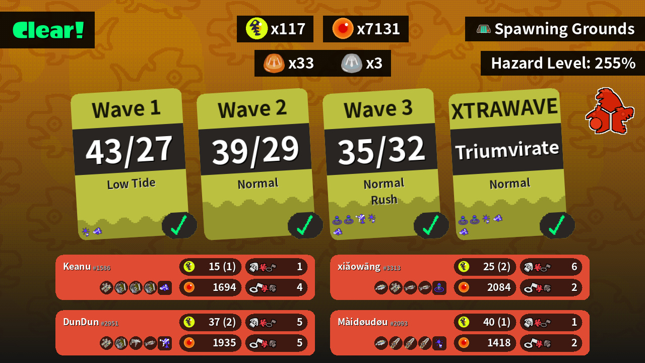 | Weapons | Grizzco Dualies Grizzco Slosher Grizzco Slosher Grizzco Slosher | Grizzco Brella Grizzco Splatana Grizzco Splatana Grizzco Splatana | Grizzco Dualies Grizzco Slosher Grizzco Roller Grizzco Charger | Grizzco Brella Grizzco Dualies Grizzco Charger Grizzco Charger |