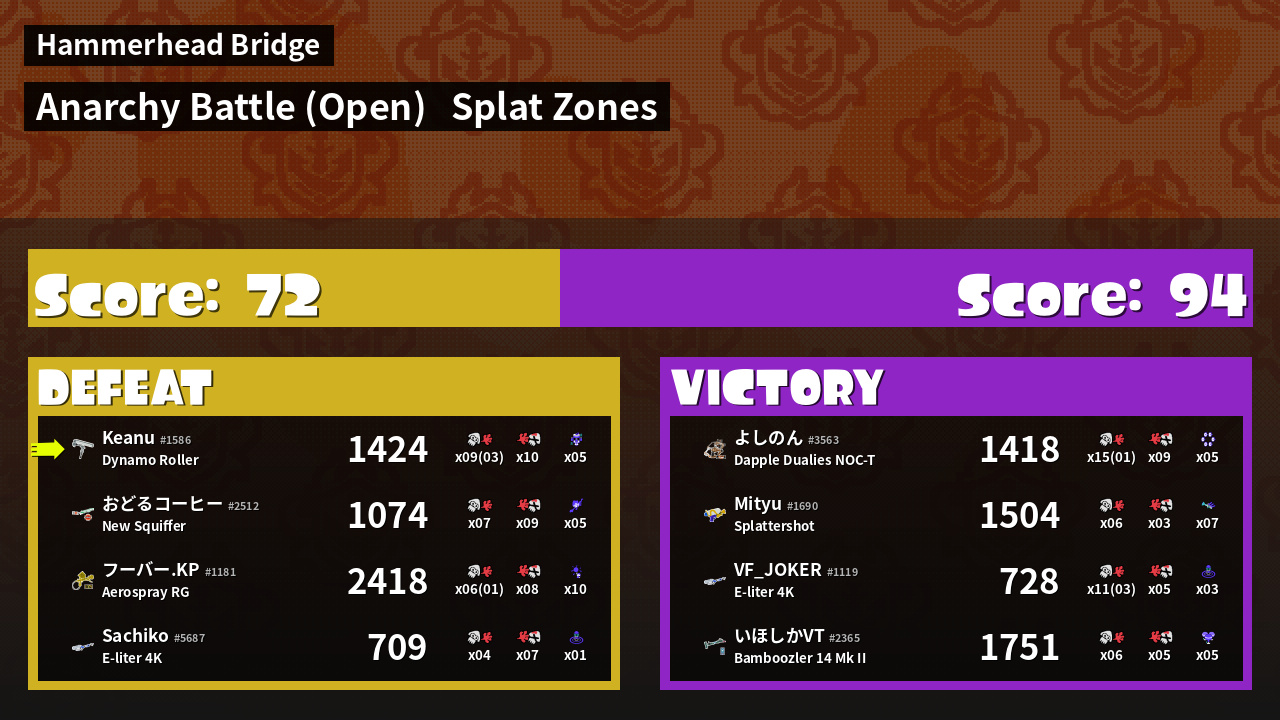 | Mode | Splat Zones - Anarchy Battle (Open) | ||