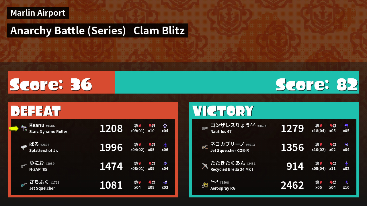 | Medals | #1 Overall Splatter #1 Score Booster #1 Clam Carrier | ||