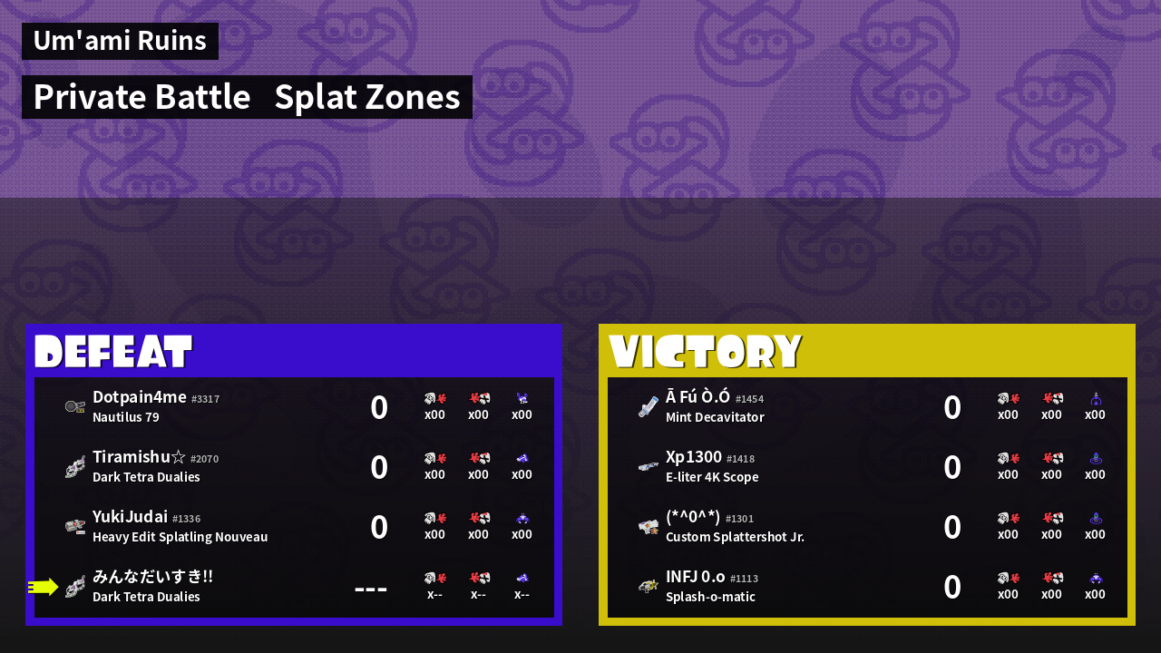 | Mode | Splat Zones - Private Battle | ||