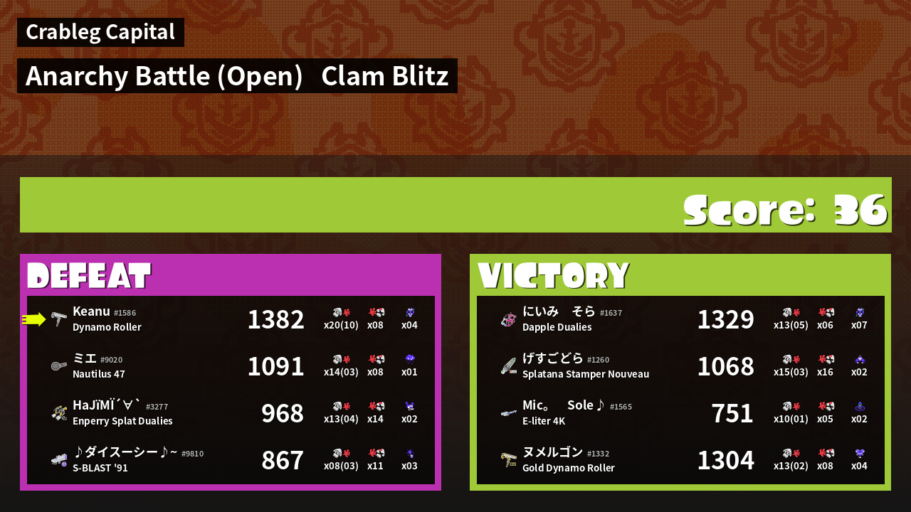 | Mode | Clam Blitz - Anarchy Battle (Open) | ||