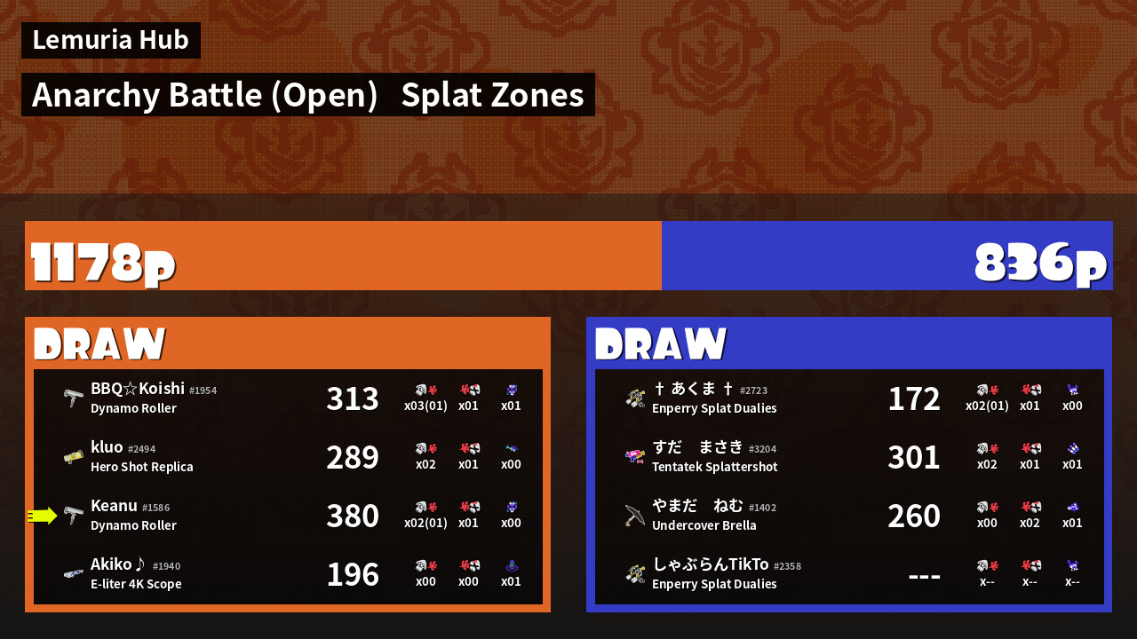 | Mode | Splat Zones - Anarchy Battle (Open) | ||
